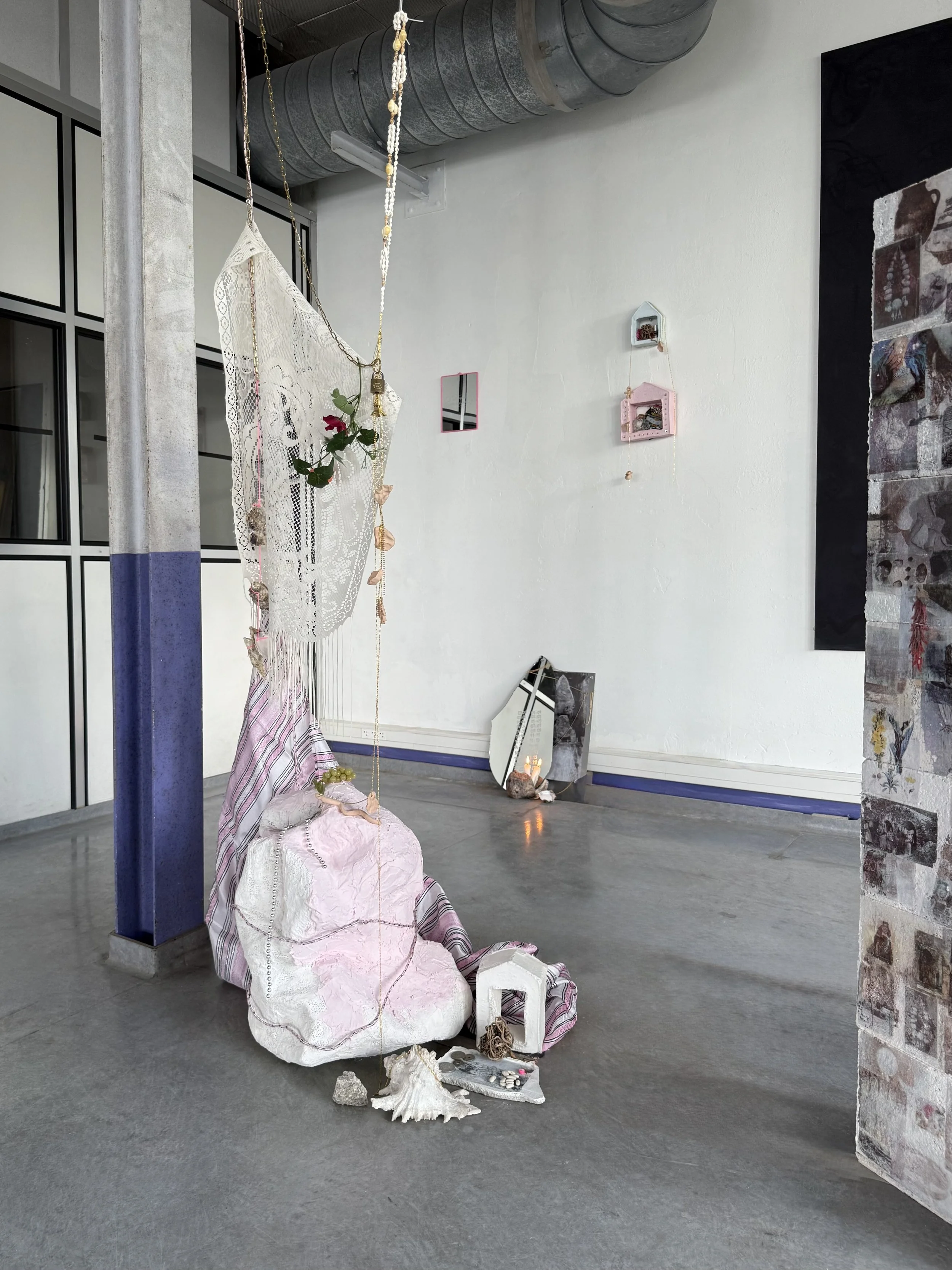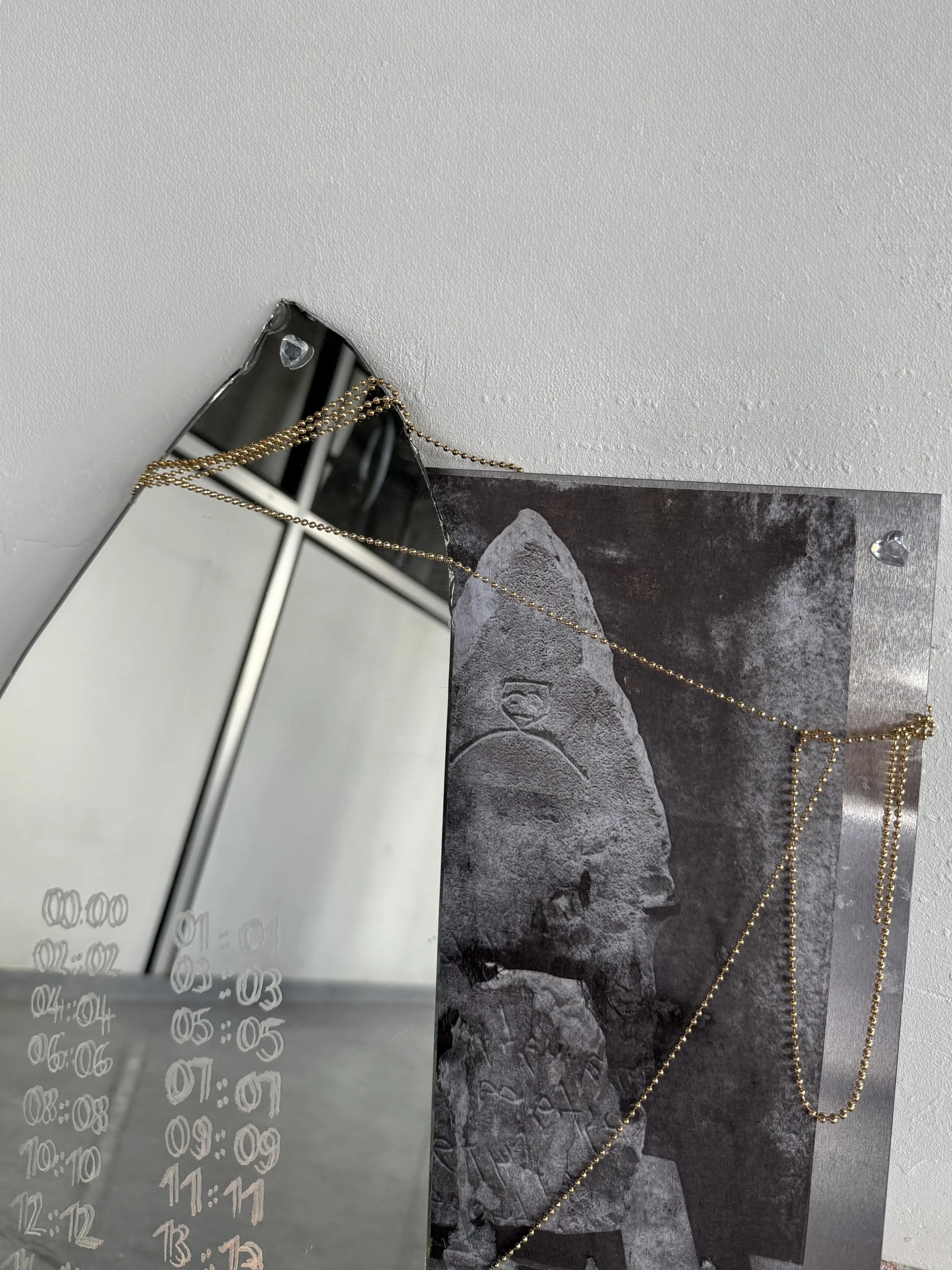 miroir brisé, transfert d’images sur aluminium, coquille d’huître, sel, chaînes dorées, bougie blanche, roche minérale, 50x35cm