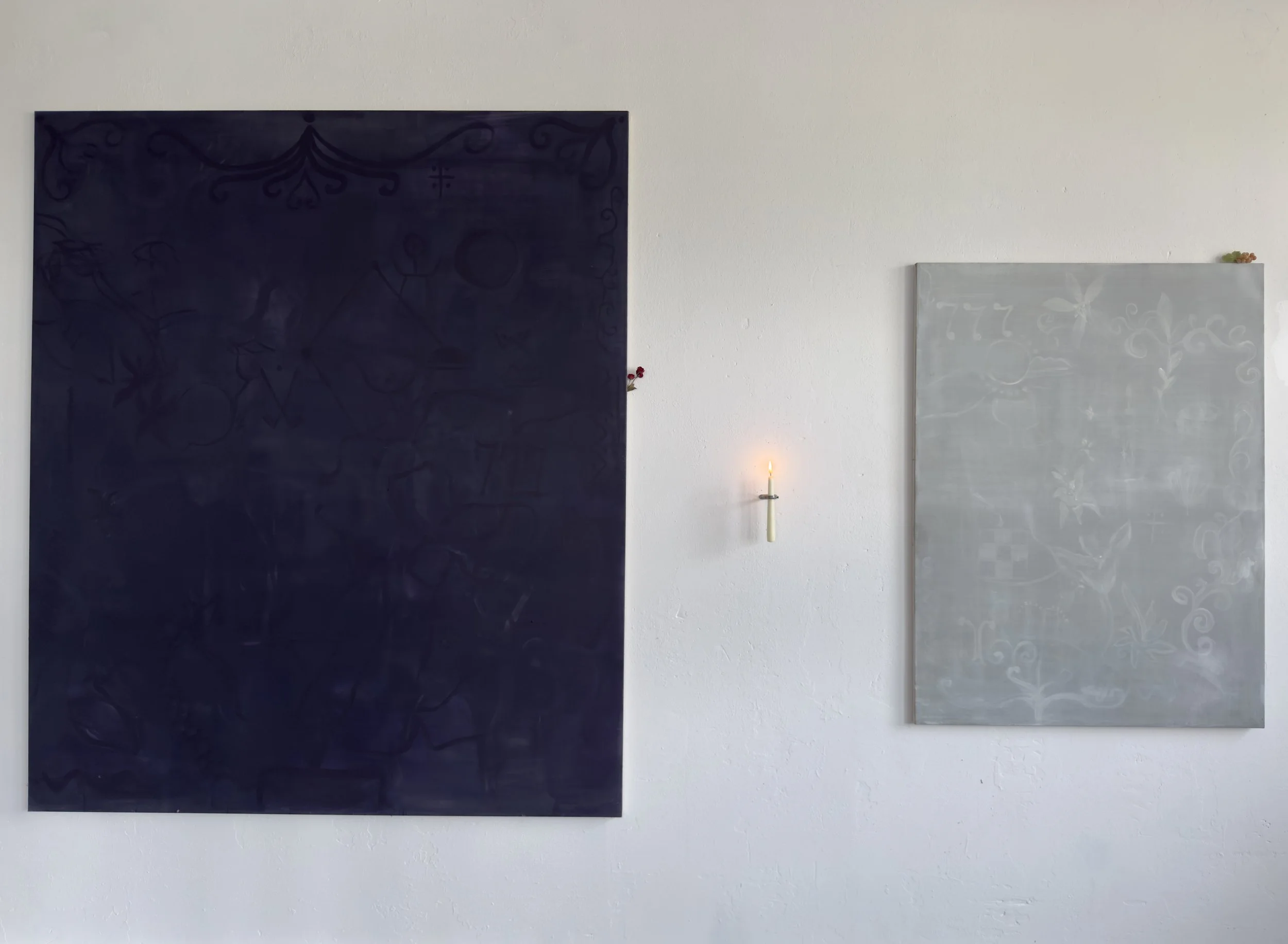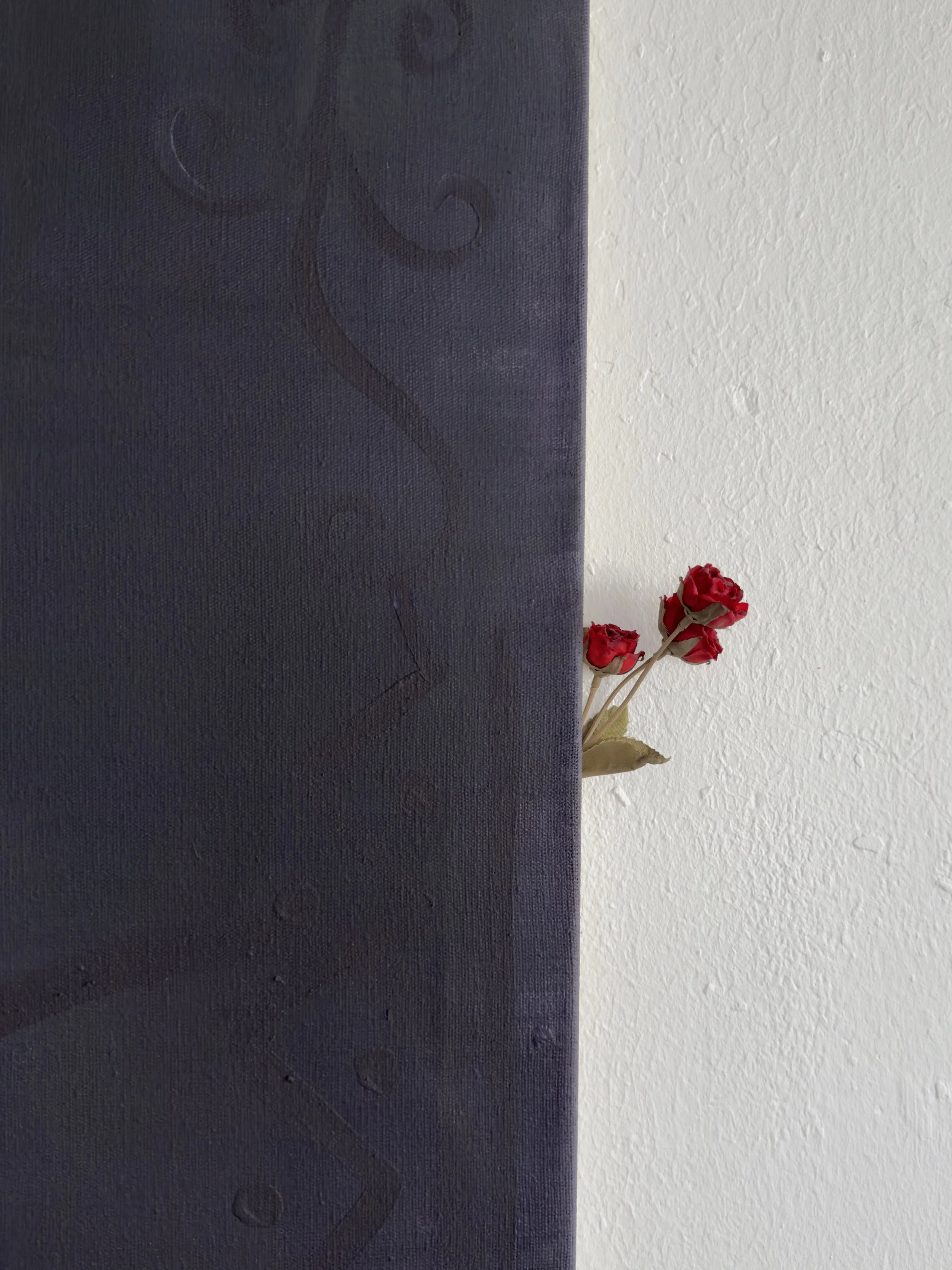 acrylique sur toile, peinture phosphorescente, roses en plastique, bougie (détails) 210x120cm