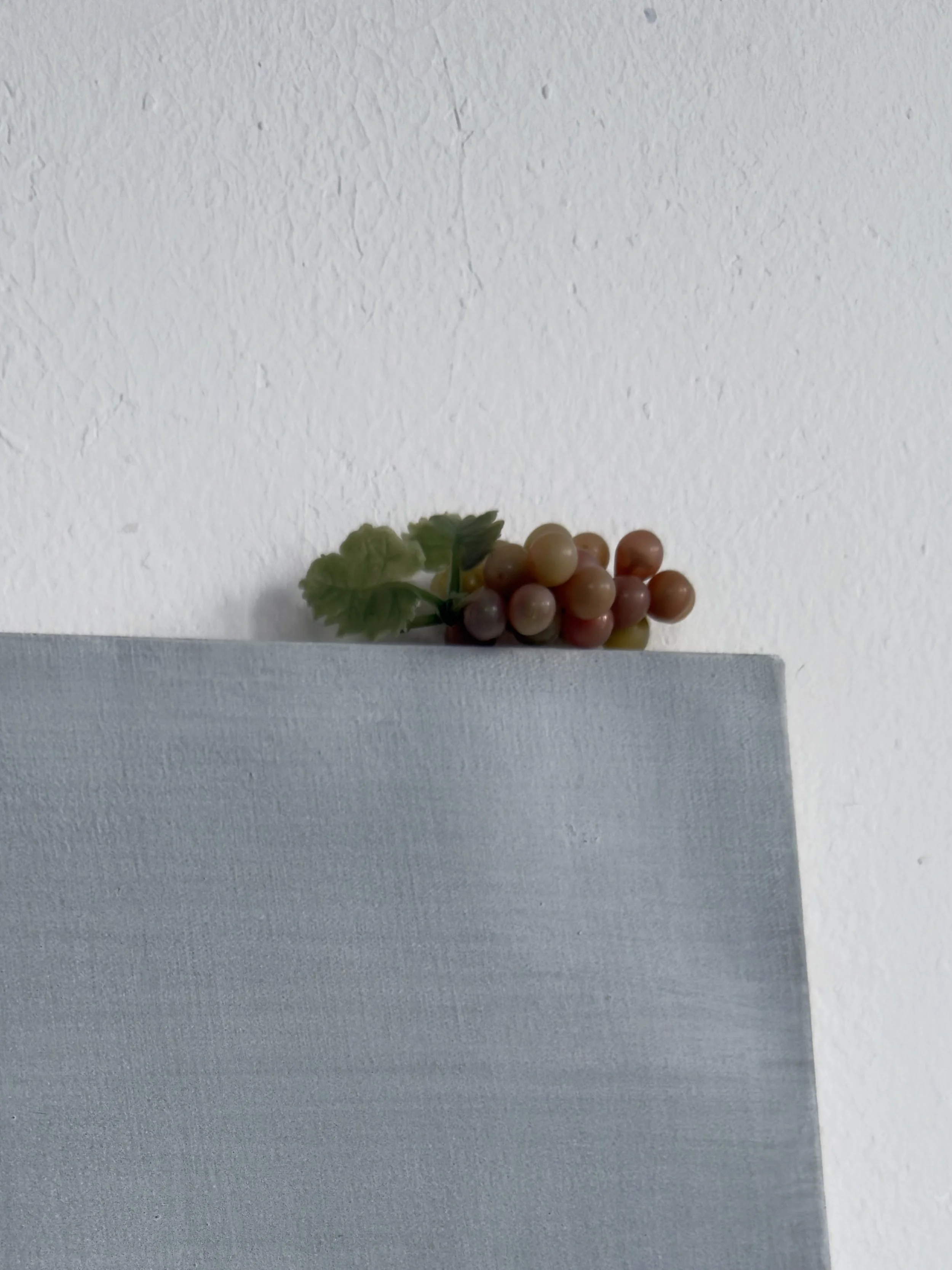 acrylique sur toile, peinture phosphorescente, grappe de raisins en plastique, bougie, 80x60cm