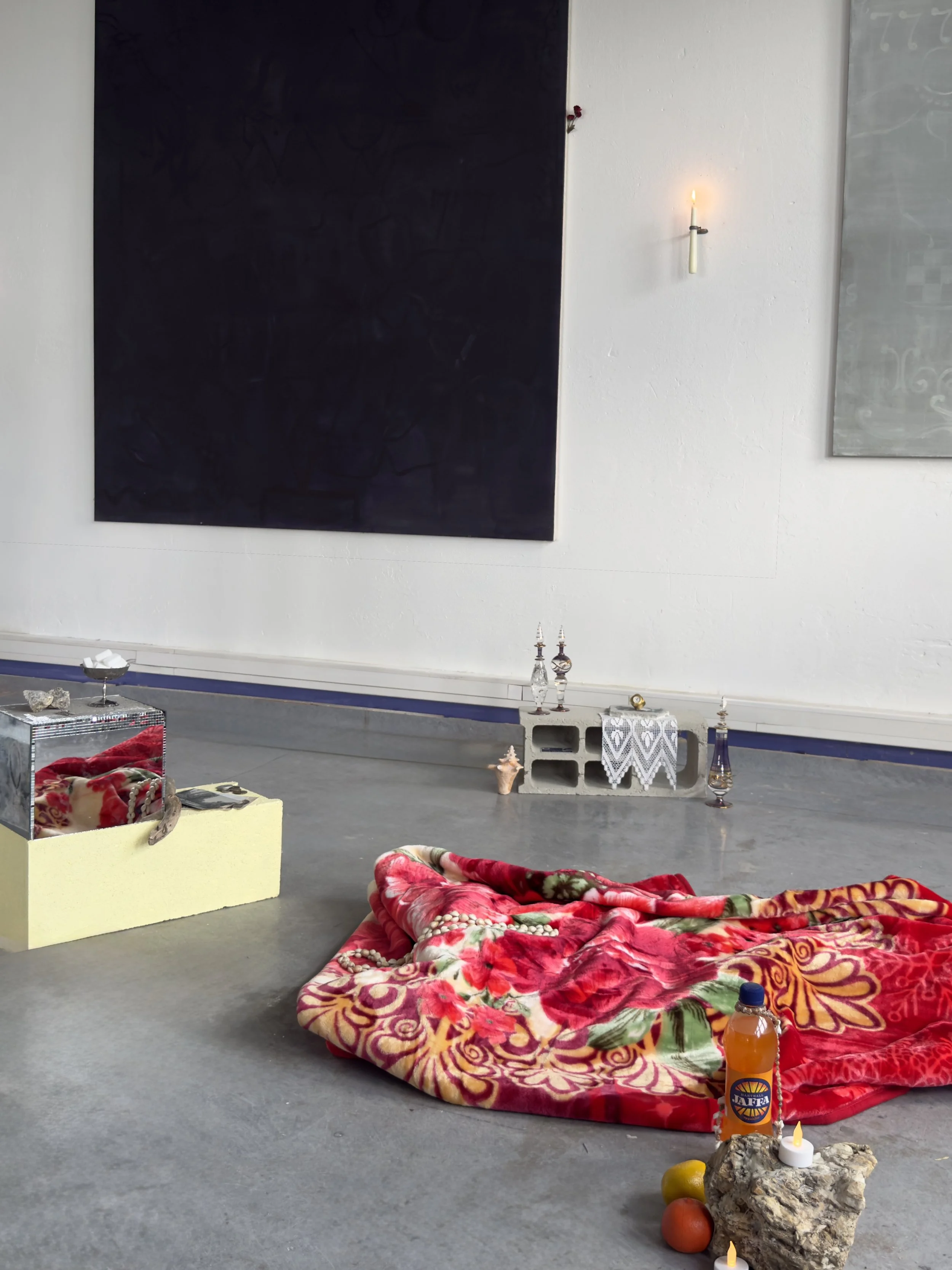 View fullsize View fullsize sweet dreams, 2025Couverture, coquillages, soda jaffa, fruits en plastique, bougies LED, roche (détails), 150x100cm
